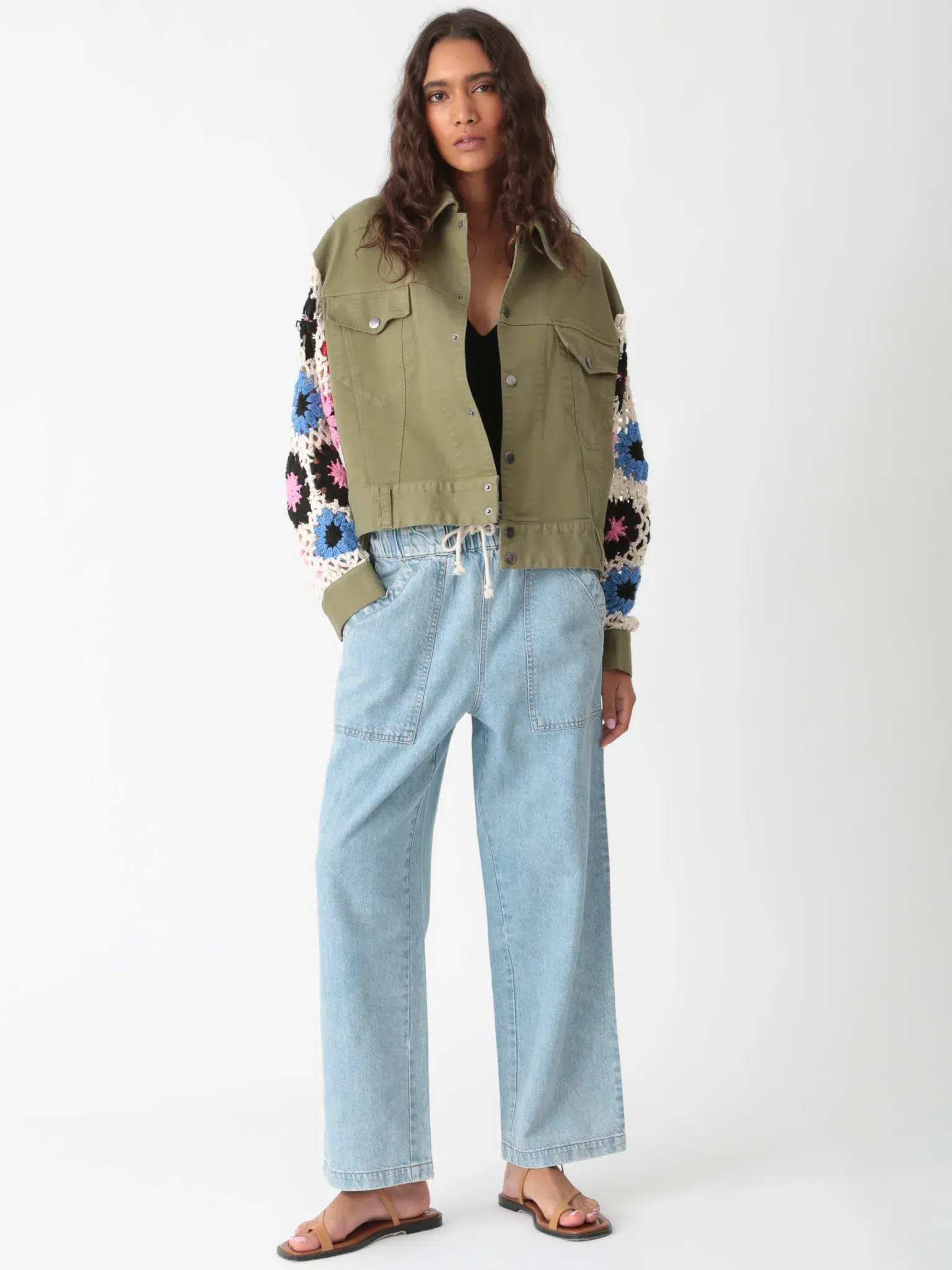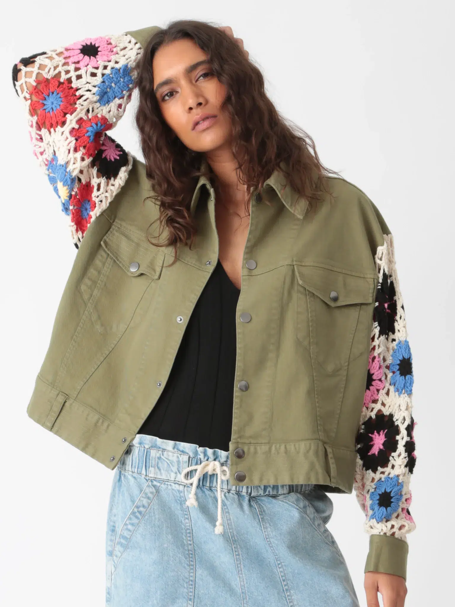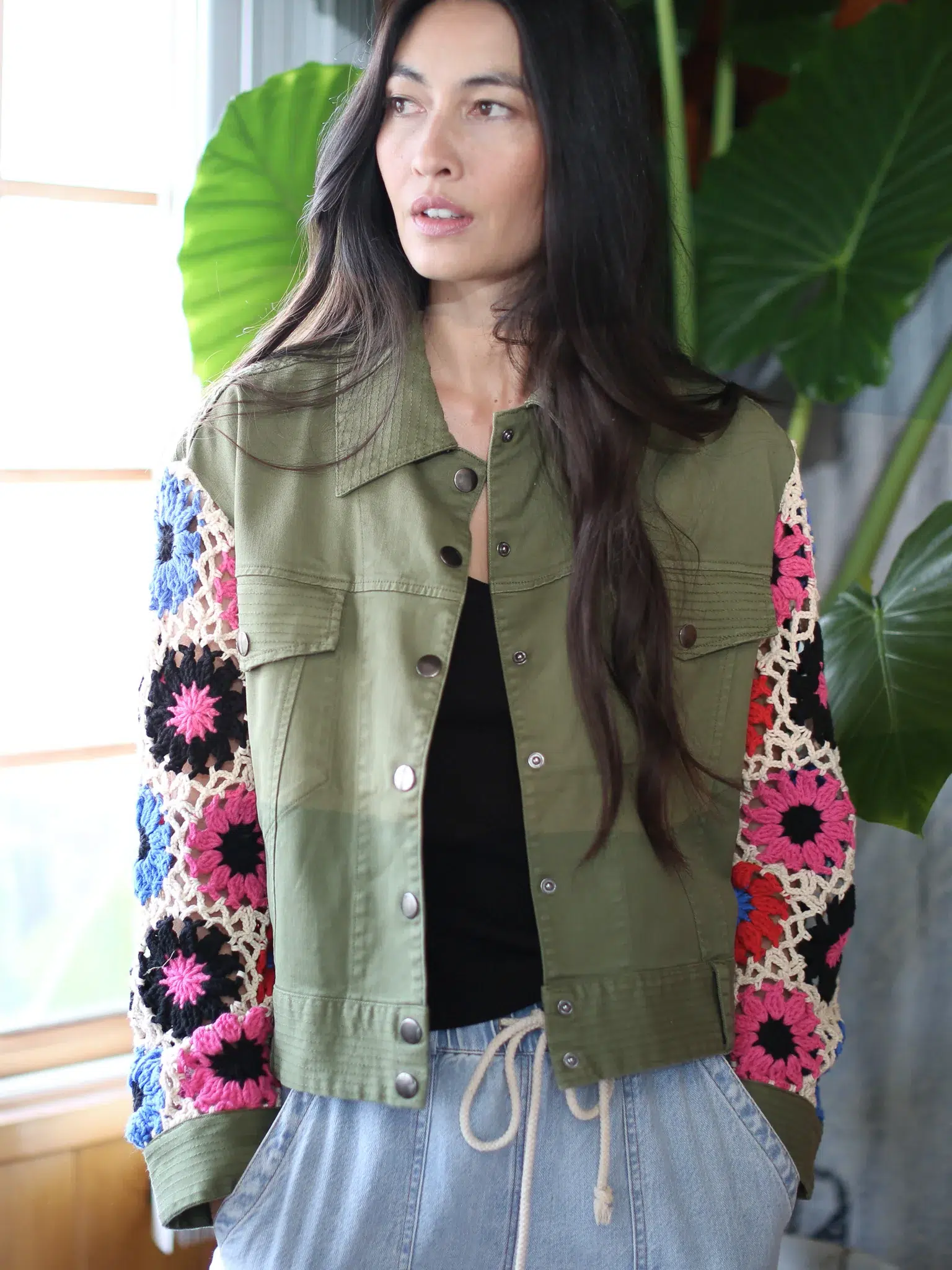 Stand out in style with our 98% Cotton 2%Sp Dyed Jacket featuring Hand – Crocheted Sleeves. This jacket showcases a classic collar and button – down front in a trendy olive hue, complemented by vibrant hand – crocheted sleeves with colorful floral patterns.