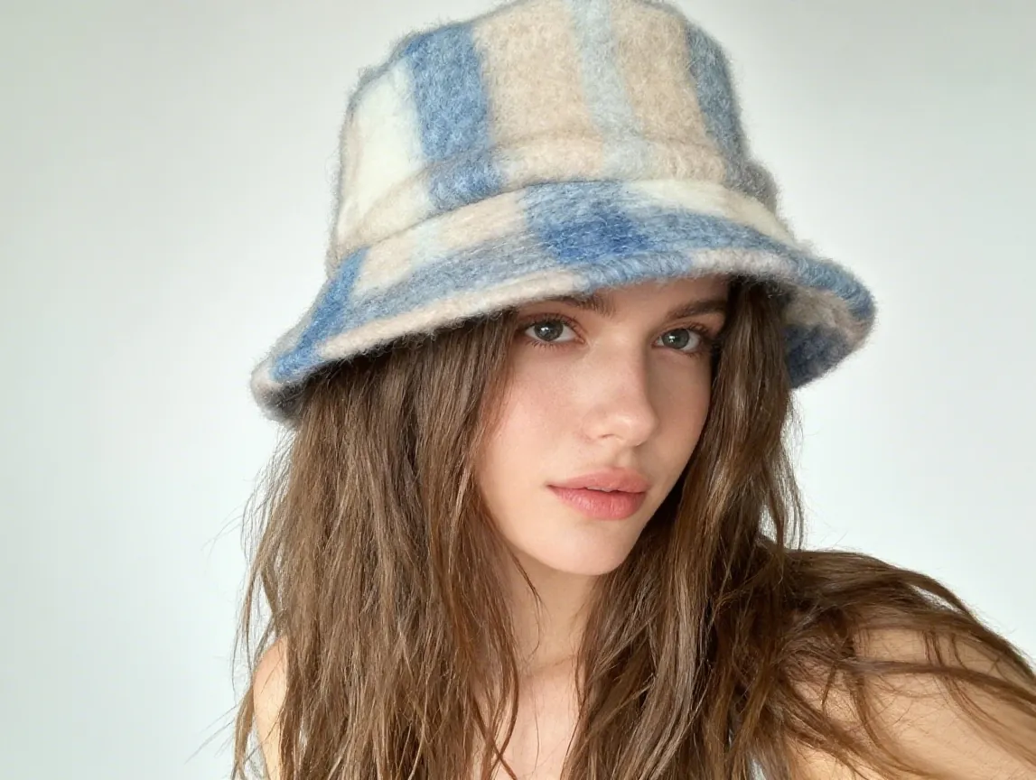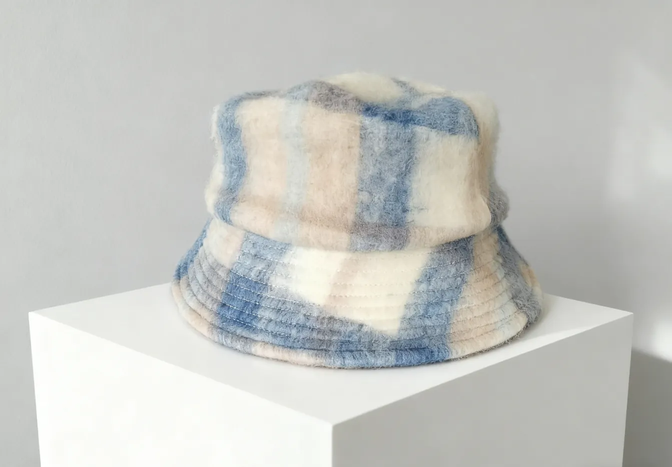 Design: Features a cozy fuzzy texture with a blue – and – beige plaid pattern, plus a classic bucket hat silhouette. The soft, muted tones and plush material create a warm, retro – inspired look.