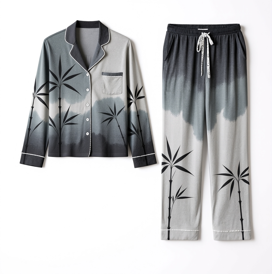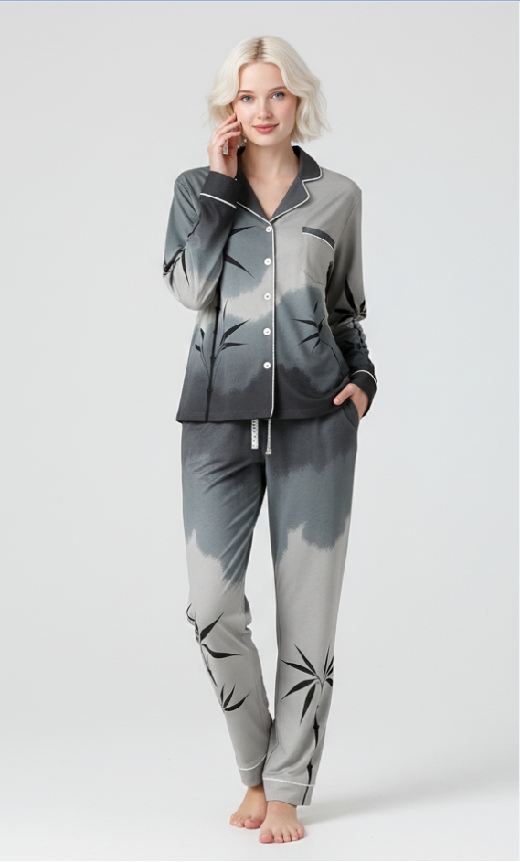 - Design: Features a stylish gradient color scheme from dark to light gray, with elegant bamboo prints adding an artistic touch. The top has a classic notch collar and button – down front, while the pants have a drawstring waist for a comfy fit.