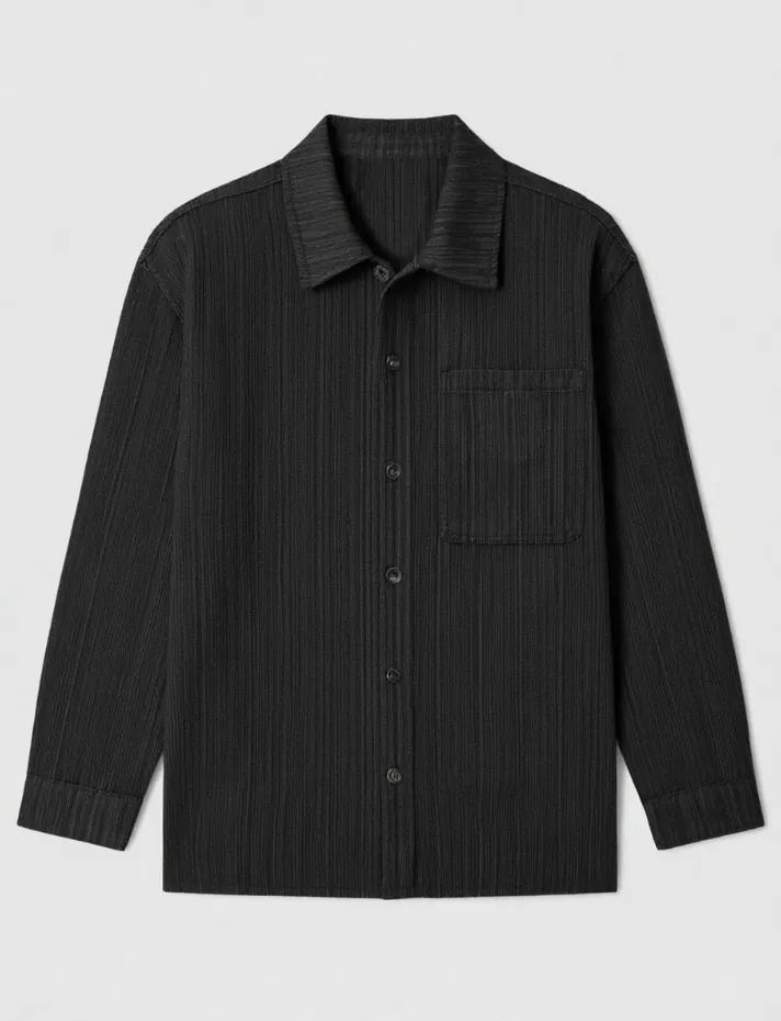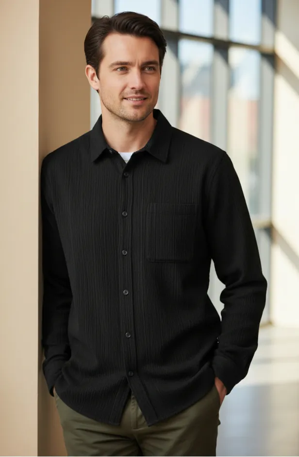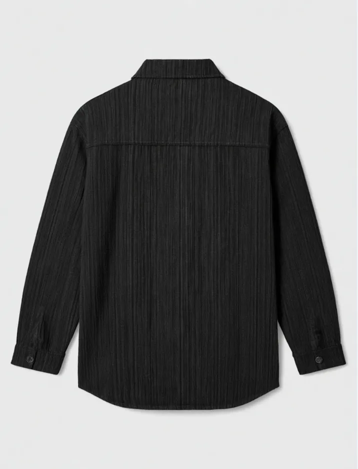- Design: Features a classic button – front closure, a chest pocket, and a unique textured pattern that adds depth and visual interest. The black color is timeless and versatile, easy to match with various outfits.