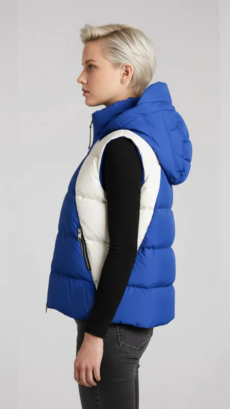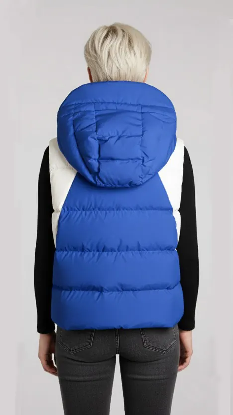 Elevate your winter layering game with our Blue – White Colorblock Hooded Puffer Vest. This vest features a striking blue and white color combination, a cozy hood for extra warmth, and a puffer construction to keep you snug. Ideal for throwing on over sweaters or tees, whether you’re running errands or enjoying outdoor activities.
