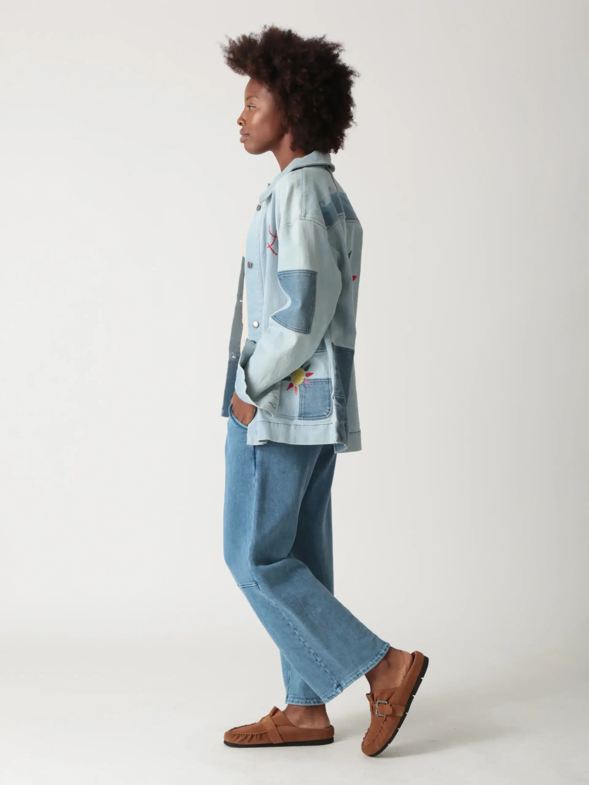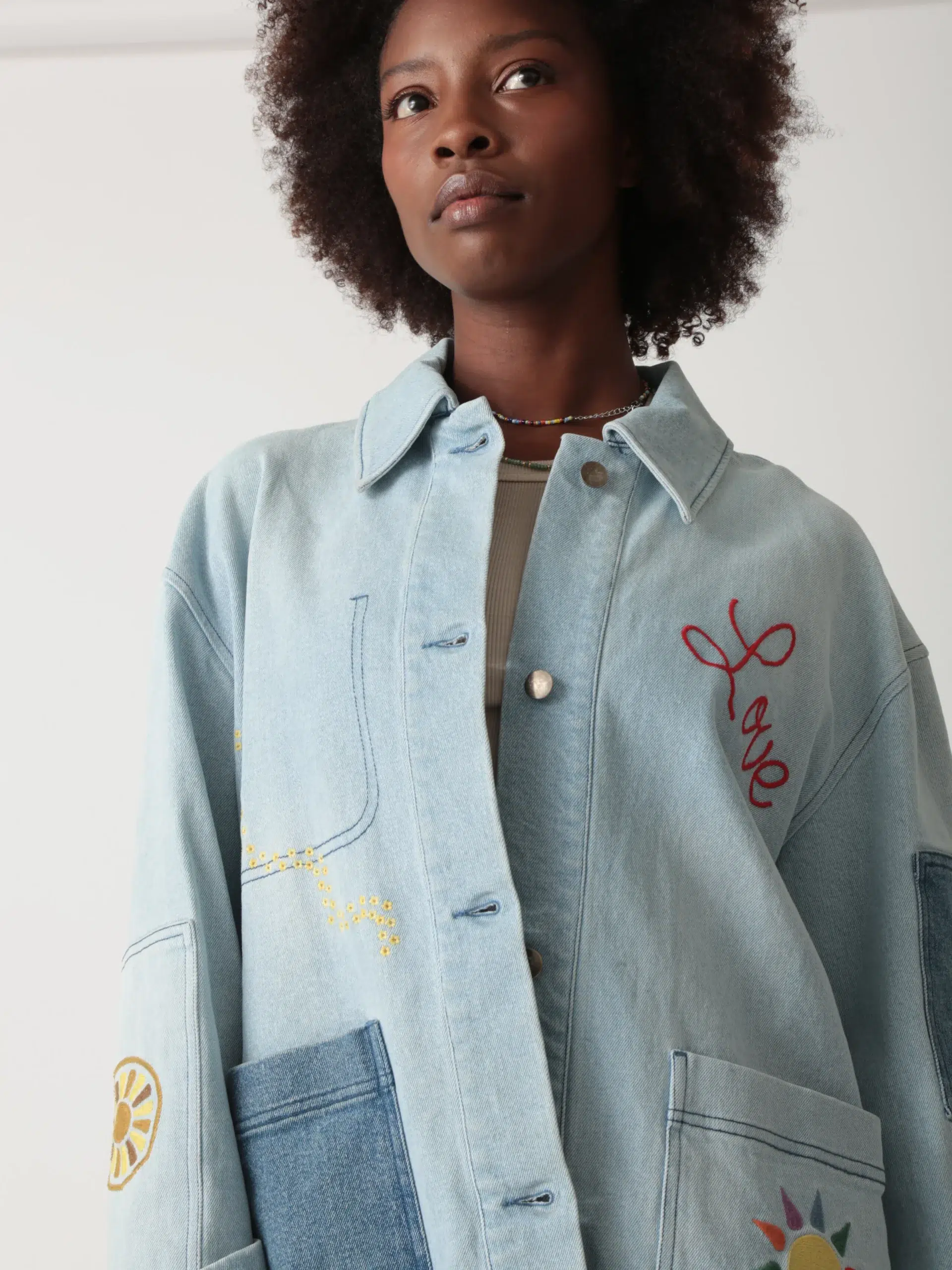 • Design:Classic collar; button – down front; multiple denim patches in different shades creating a patchwork effect; various embroidery designs including the word “Love”, sun – like motifs, and floral patterns scattered across the front, back and sleeves; functional pockets