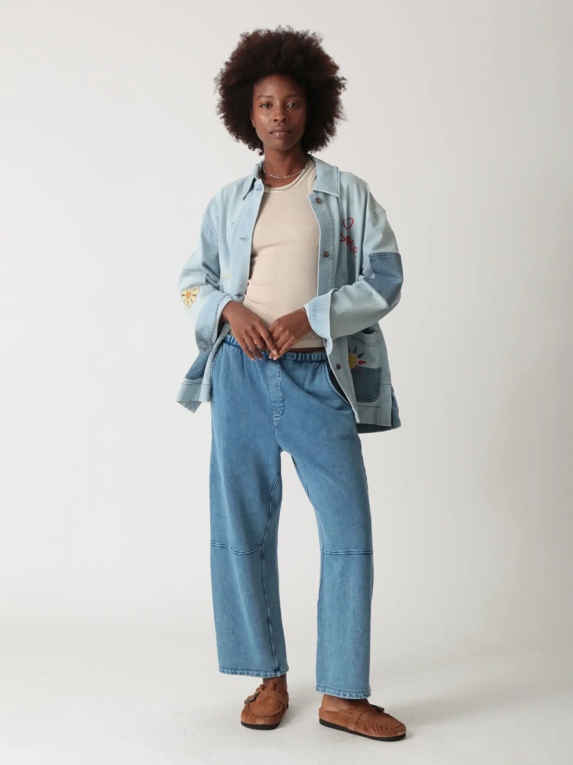 Upgrade your casual wardrobe with our Denim Patchwork Embroidered Jacket. Combining the timeless appeal of denim with unique patchwork design and charming embroidery like the word “Love”, sunflowers, and stars, it’s perfect for adding a touch of personality to any outfit.