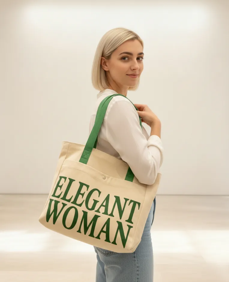 - Design: Features bold green “ELEGANT WOMAN” lettering on a soft beige canvas, paired with vibrant green shoulder straps. The color contrast gives it a chic, eye – catching look.