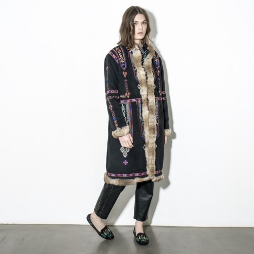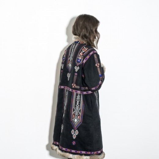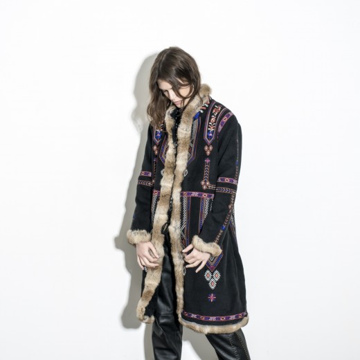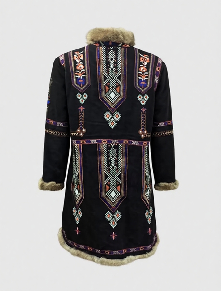 - Color: Black main body + multi – colored embroidery (purple, orange, white) + light brown fur trims. The contrast is striking and looks amazing.
