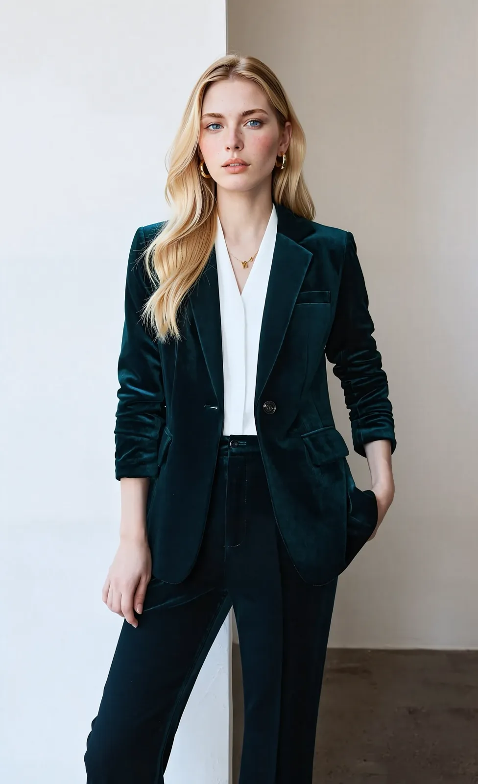 This “Emerald Velvet” blazer is crafted from premium heavyweight emerald green velvet, featuring a soft, luxurious texture and timeless retro luster. The sharp notched lapel, single-button closure, and tailored fit cinch the silhouette perfectly, complemented by structured pockets and exquisite detailing. Versatile for office, dates, parties, and formal events, it pairs seamlessly with white shirts or camisoles for an elevated look, making it a timeless wardrobe staple.