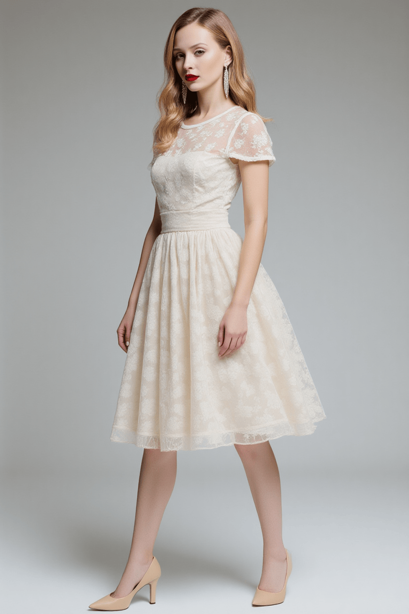 - Design:Round neckline; short sheer lace sleeves; fitted bodice; elastic waistband; flared midi skirt