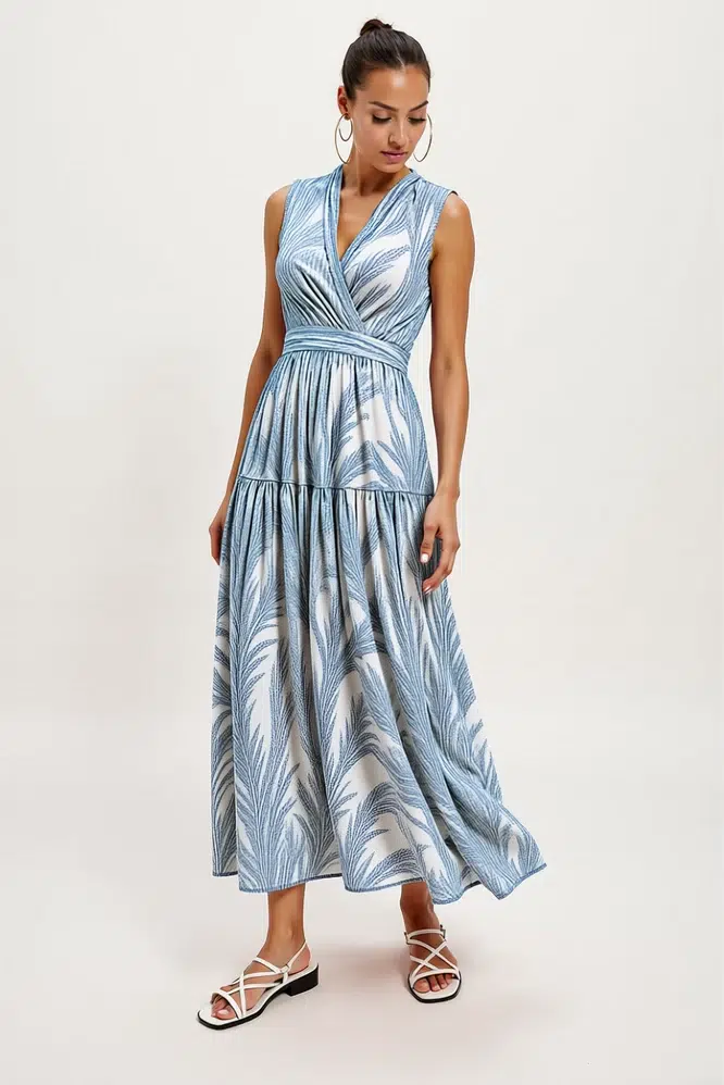 Elevate your summer elegance with our Leaf Print Wrap Tiered Maxi Dress – Blue & White. This graceful dress features a flattering V – neck, sleeveless silhouette, and tiered skirt for a flowy fit. The delicate leaf print adds a touch of nature – inspired charm, perfect for garden parties, beach vacations, or sophisticated outings.