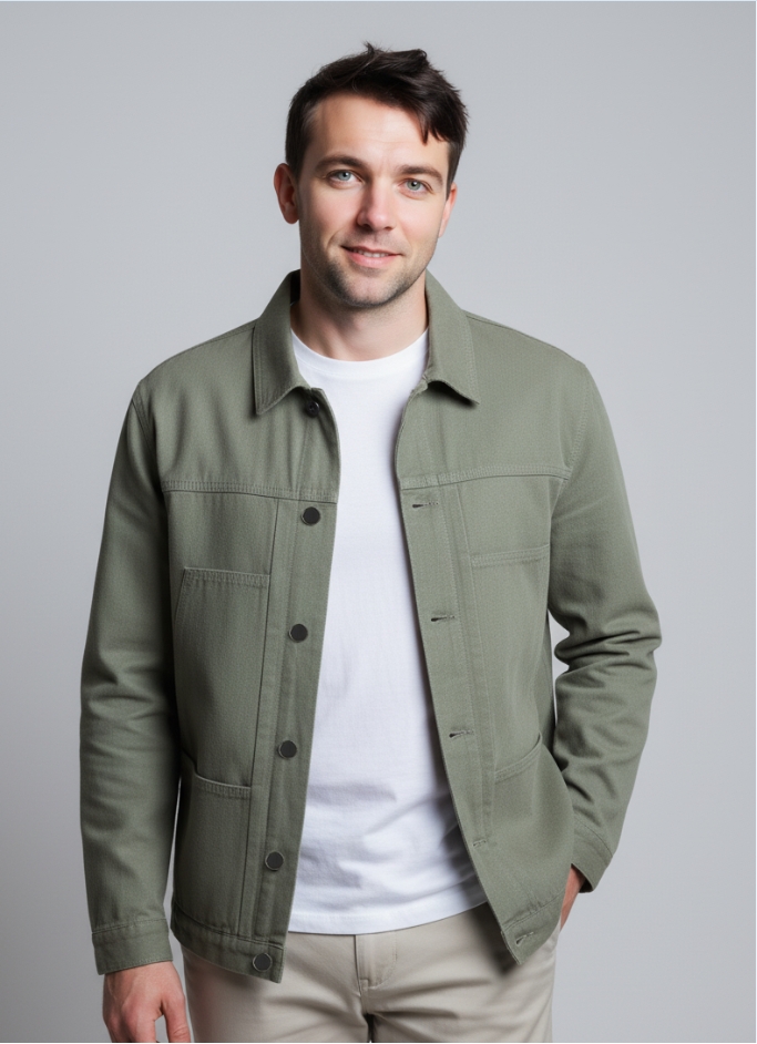 • Design: Features a classic button – front closure, multiple pockets, and a unique patch on the chest that adds a touch of personality. The olive green color is versatile and trendy.