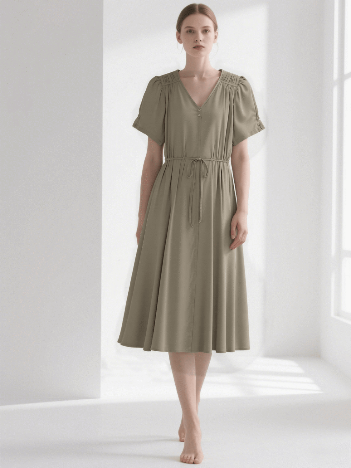 Elevate your everyday elegance with our Pleated Sleeve Tie – Waist Midi Dress – Khaki. This chic dress features a V – neckline, short pleated sleeves, and a tie – waist for a customizable fit. Perfect for work, weekend outings, or casual gatherings, it blends comfort and sophistication.