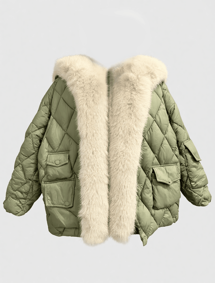 Stay warm and stylish with our Quilted Faux Fur Hooded Puffer – Sage Green. This mid-length quilted puffer features a diamond – pattern shell (showcased on both front and back) and an oversized faux fur – lined hood for ultimate coziness. Perfect for winter layering, it blends practical warmth with luxe style—offering a chic, cohesive look from every angle for your cold – weather wardrobe.