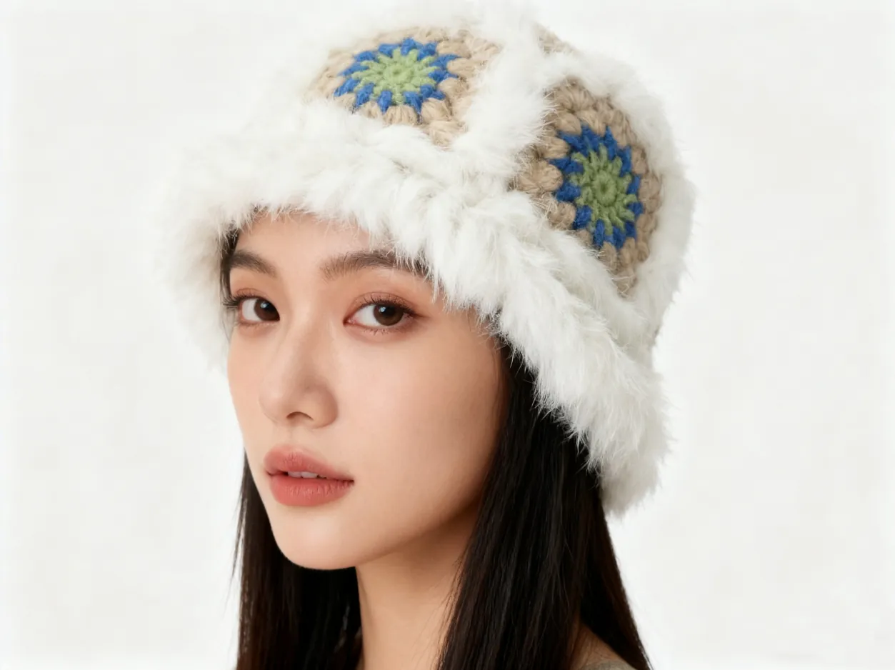 Design: It features handcrafted crochet panels in a neutral beige base, decorated with bright blue and green floral – like patterns. Lush real rabbit fur trims the brim and fills the gaps between crochet sections. The mix of textured crochet and soft rabbit fur creates a luxuriously cozy yet artistic look.