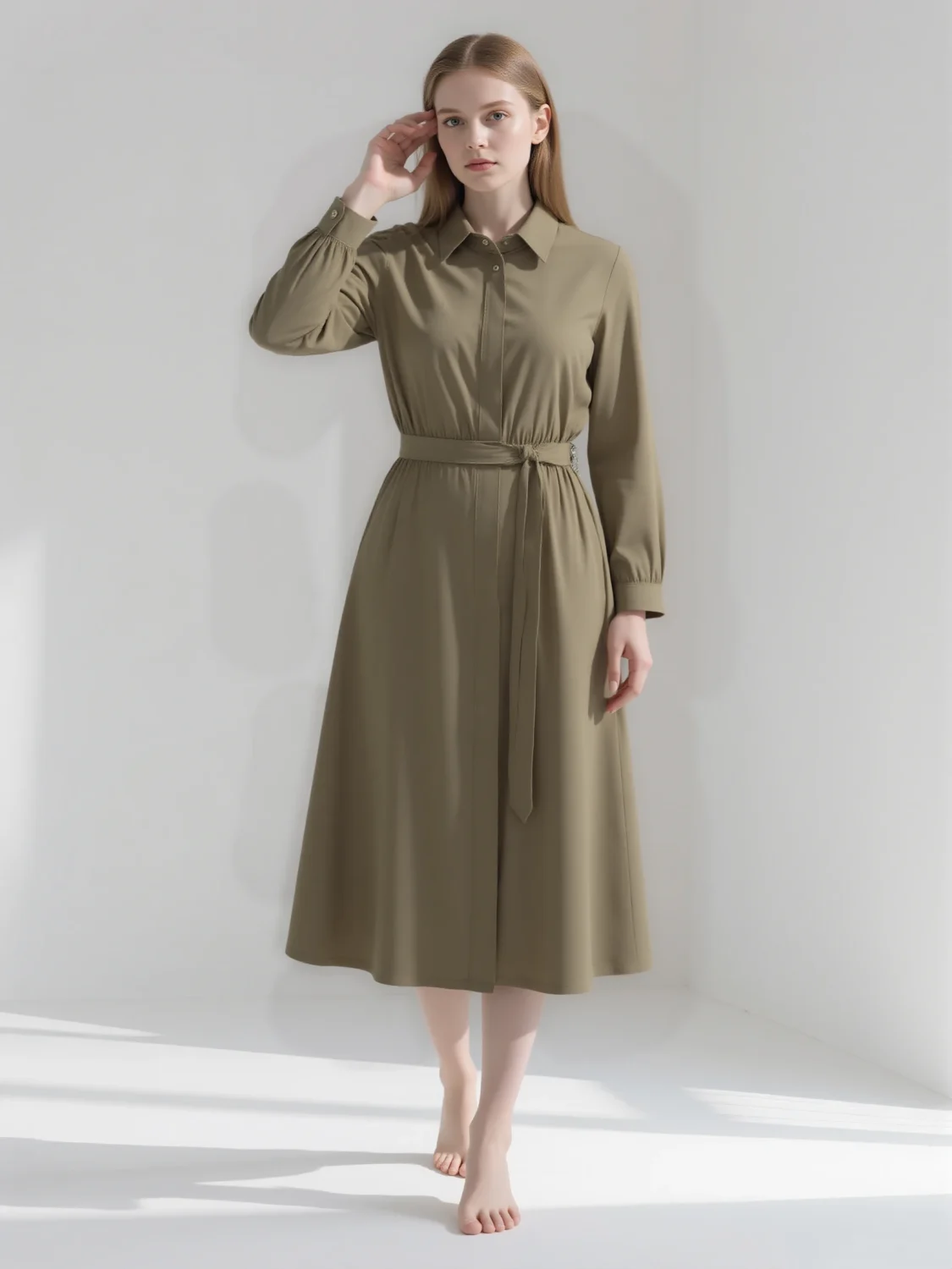 Elevate your workwear with our Shirt Dress with Belt – Khaki. This timeless dress features a collared neckline, long sleeves, and a belted waist for a polished fit. Perfect for office days, business meetings, or smart – casual outings, it blends comfort and sophistication.