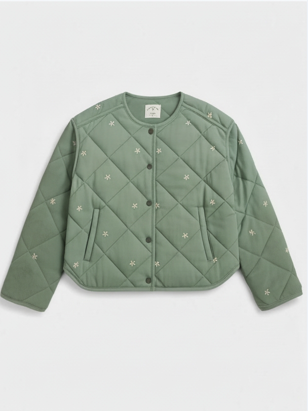 - Design: Round neck design for a simple and elegant look; front button closure for easy wear; long sleeves; diamond – quilted pattern all over for enhanced insulation; delicate small floral embroidery scattered on the jacket, adding a charming and stylish touch; two side pockets for practicality.